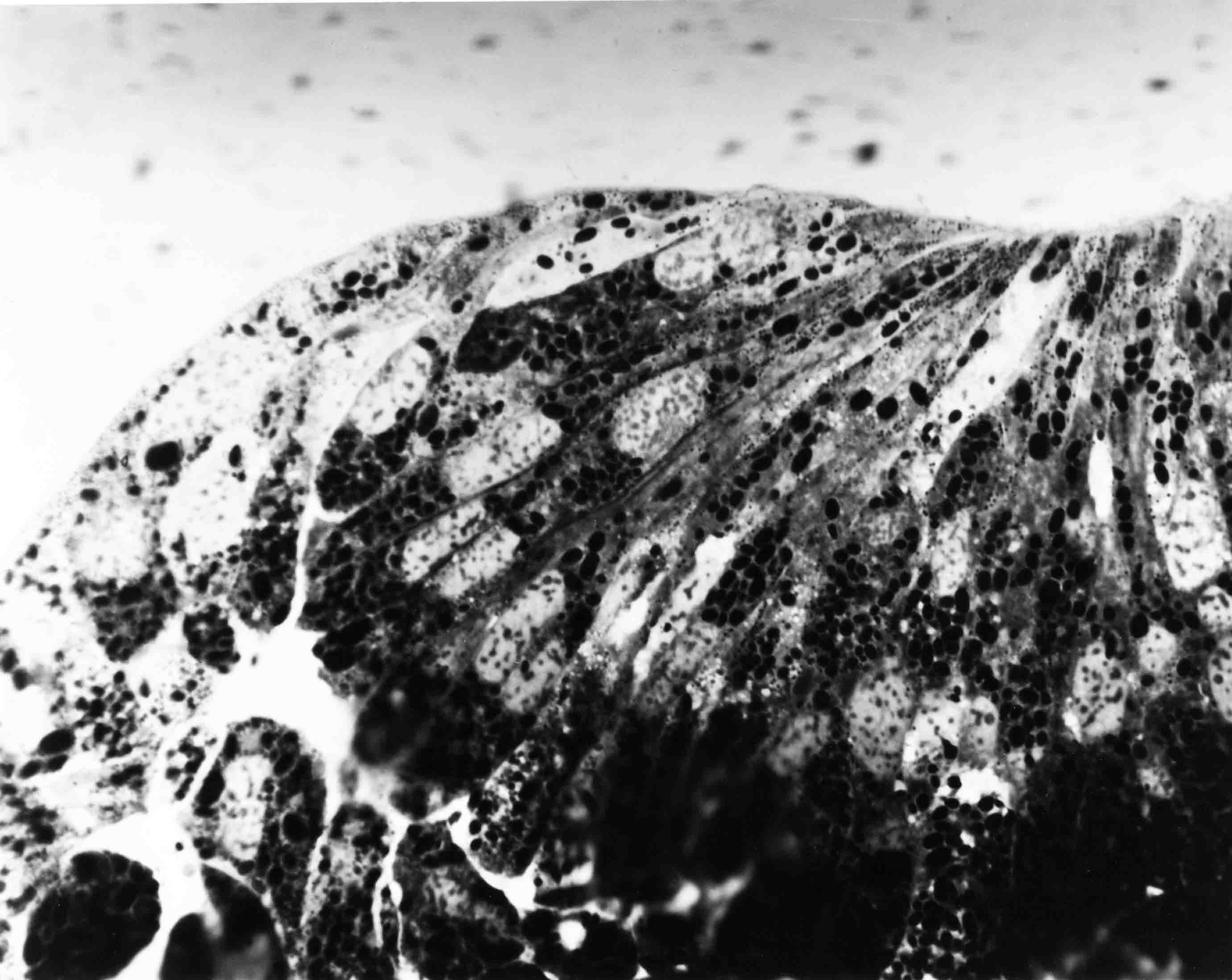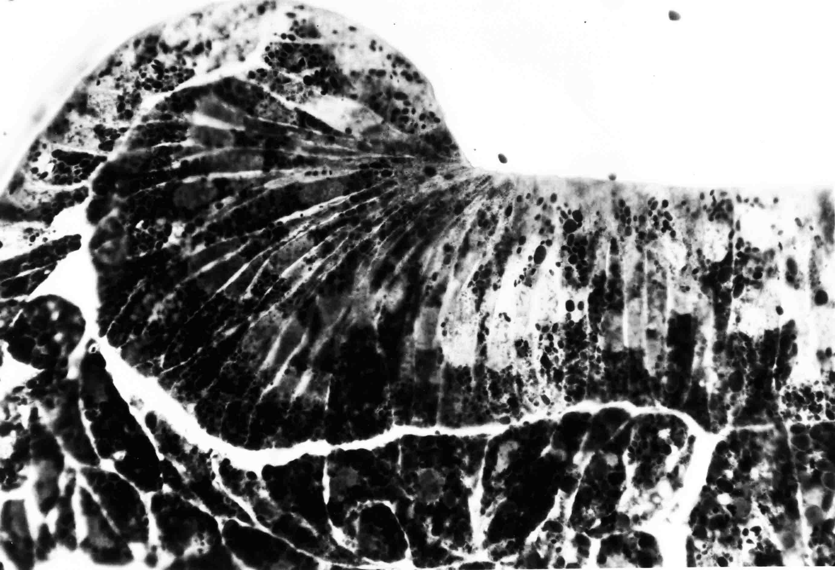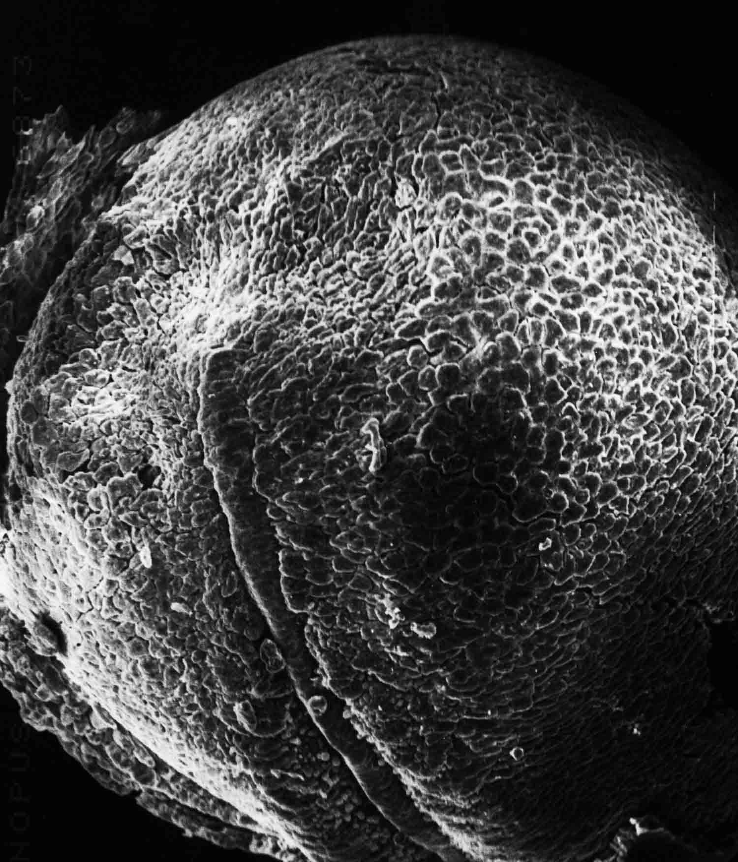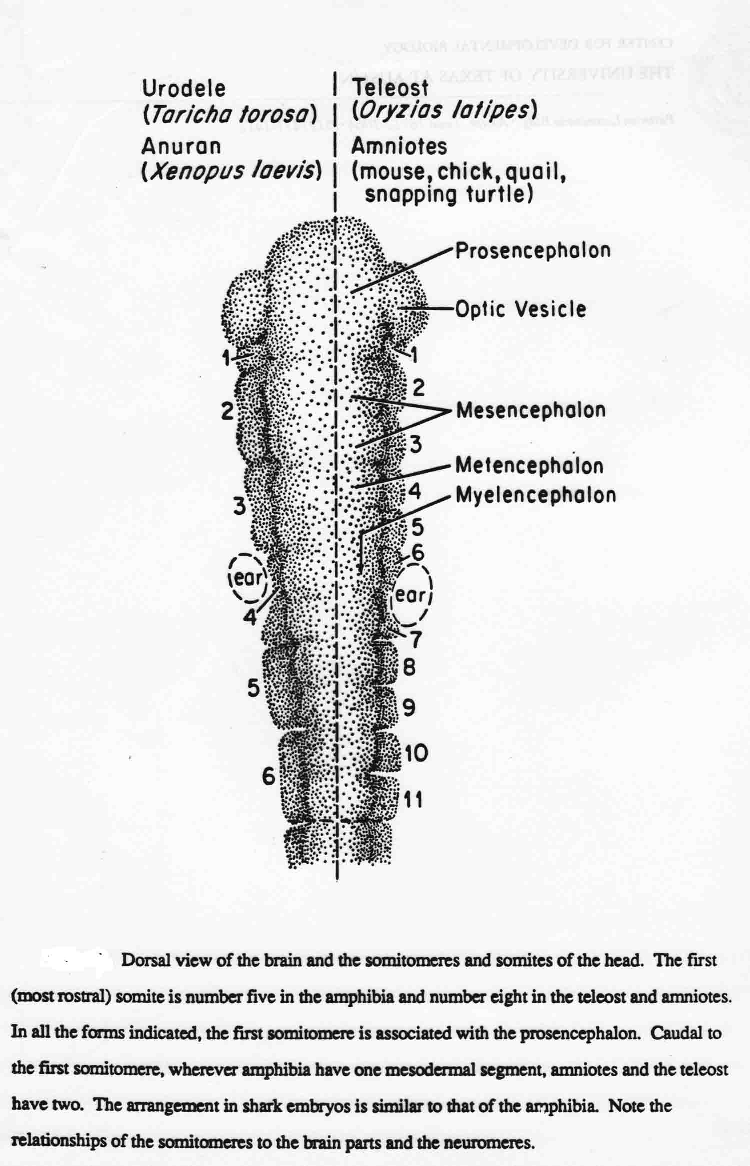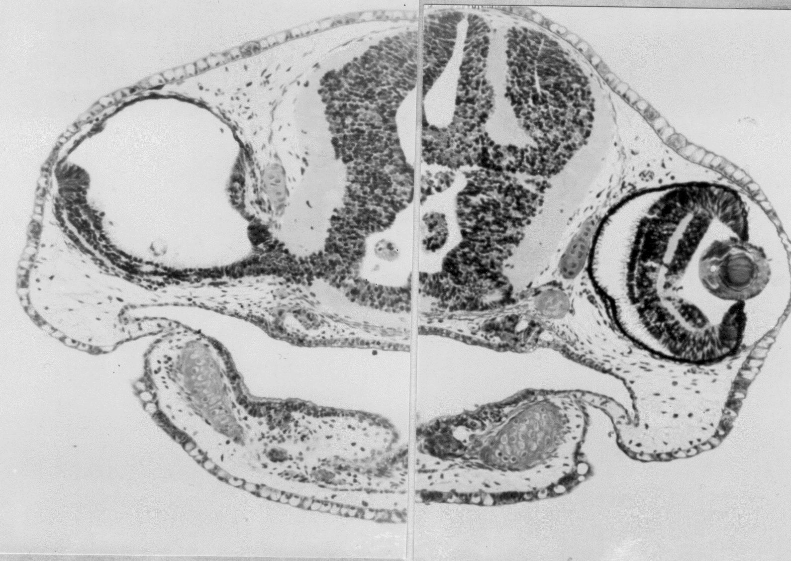![]() ![]() ![]() Section through the eyes of a newt embryo. One eye has a normal lens, the other has an ear vesicle in place of the lens. At an earlier stage, presumptive ear ectoderm was implanted in place of the presumptive lens epidermis. ![]() Section through the eyes of a newt embryo (T. torosa) at stage 40. The head was injected with 1/2 % agar below the right eye at stage 23. The agar prevented eye invagination with these remarkable results. ![]() Overview (SEM) of the left side of a newt embryo at stage 34 (see Normal Stages). The surface of the embryo is covered with many cilia. ![]() The open neural plate has been removed from the top of this frog embryo, revealing the underlying dorsal mesoderm in dorsal view in this SEM. The notochord at the midline ends at the anterior end of the midbrain. Somitomeres are visible to each side of the notochord. In front of the tip of the notchord are the two most anterior cranial somitomeres, with the prechordal plate between them. The forebrain (removed) would overlie these two somitomeres. ![]() ![]() Positions of the epidermal pacodes at the open neural plate stage of a salamander. ![]() This is an experiment with a newt embryo at stage 14. The embryo is bisected at the line and each half then grown in culture to stage 18. Each half independently neurulates. ![]() The 'Notoplate" is the group of cells in the neural plate that dirctly overlie the notochord. On the figure above, The labels "notochord" should be "Notoplate". The notoplate cells are shown at stage 13 (left) and at stage 15 (right). The notoplate cells rearrange and greatly help elongate the neural plate during neurulation. Notoplate cells attach to neural plate cells at each side and narrow the width of the notoplate while elongating the midline of the neuralplate. We asked, does the elongating plate advance craniad while pushing aside neural plate cells craniad to the notoplate? I counted the neural plate cells directly anterior to the notoplate and found 80 cells at each stage, so the neural plate cells accomodate the advancing notoplate by changing shape to become much taller cyindrical cells with much decreasd diameters. It is also possible this shrinkage of the neural plate cells aids the advance of the notoplate. ![]() Section through the left edge of the neural plate (T. torosa) at stage 14. This so-called "thick plastic section" is 2 microns thick. Fixation was done on the egg. Individual neural plate cells can be seen for the length of the cell. Basal surfaces of neural plate cells that contact the epidermis lift the epidermis upward. The resulting rolling moment begins the creation of the neural fold. ![]() Section similar to the preceding, but at stage 15 when the neural fold is apparent. During neurulation, the nervous system is wrapped round the embryo. Optical foreshortening obscures the total lengths of the nervous systems. This figure below shows intact embryos at the right and middle, and from the same embryos, their nervous systems dissected out, laid out flat, and photographed immediately (figures at left). ![]() The picture below is the undersurface of a chick somitomere. The arrangement of the somitmere cells around the midpoint is especially clear in such SEM's. ![]() |