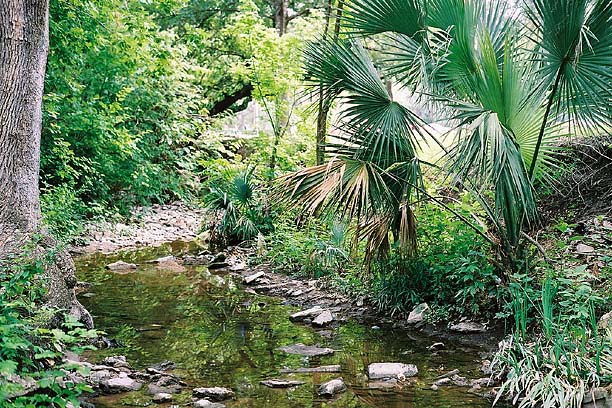 As one moves upstream from the Austin Presbyterian Seminary grounds, the size and number of Texas Palmettos gradually decrease. The picture above is from the edge of the seminary to a large tree (top right edge). The picture below is from the large tree (left margin) upstream a short distance.